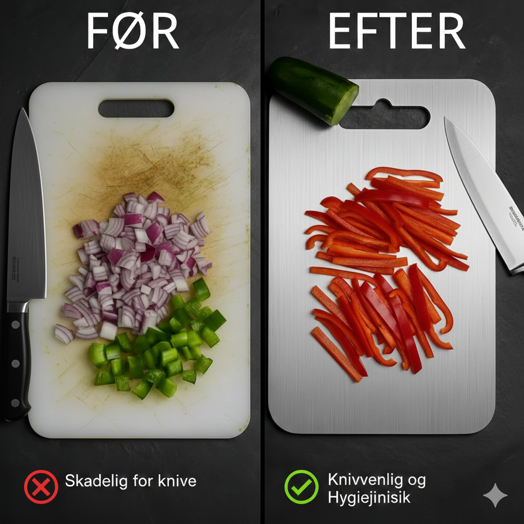 ❌ Glas/Stål/Sten – Ekstremt hårde overflader, som slider skarpheden af dine knive og gør, at de skal slibes langt oftere. Kan endda beskadige skæret permanent.